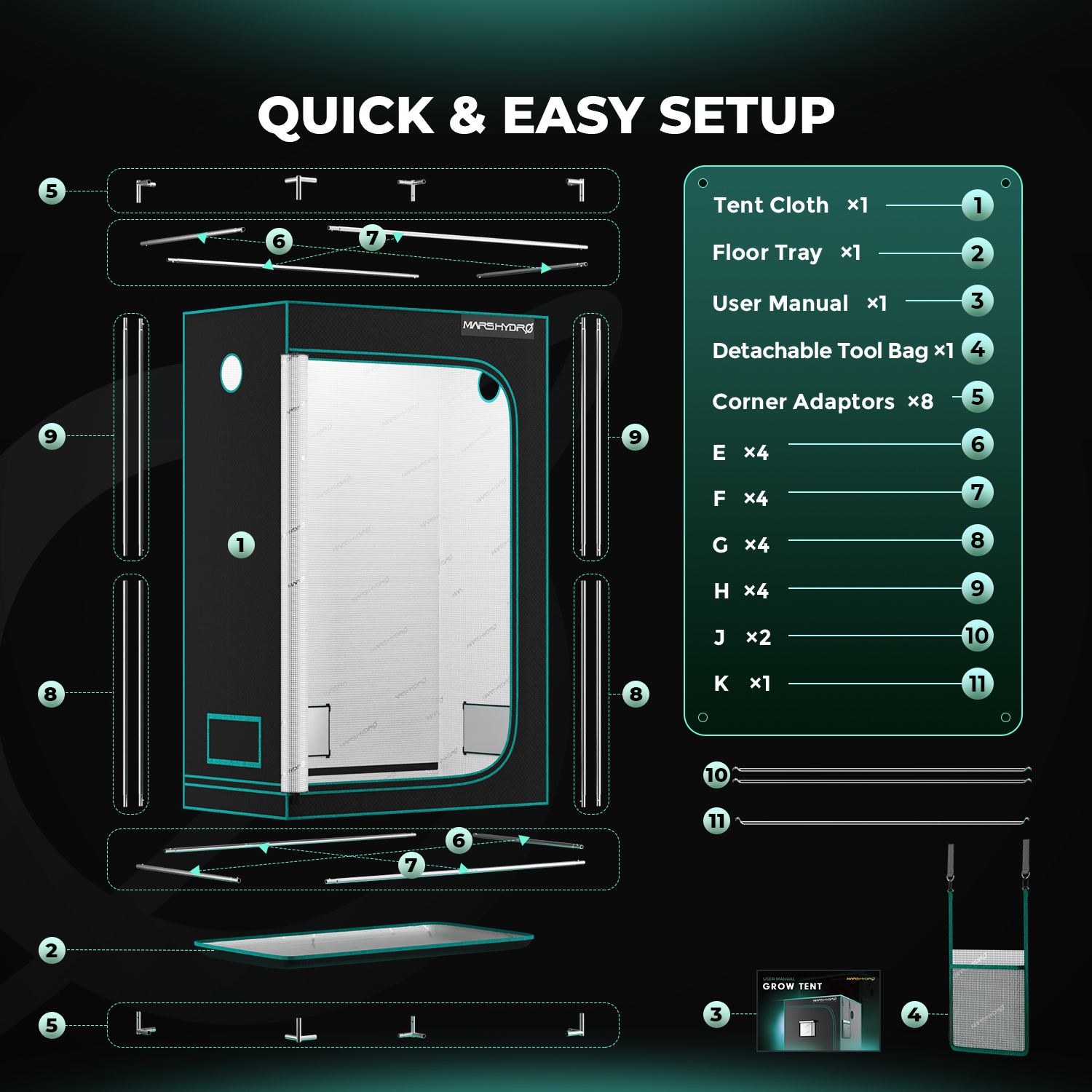 Mars Hydro 120x60x150cm sise telk on loodud pakkuma ideaalset keskkonda taimede kasvatamiseks siseruumides. Selle telgi tugev ja vastupidav 1680D Oxford kangas on rebenemiskindel ning selle sees olev peegeldav mylar vooder suurendab valgustuse efektiivsust ja aitab hoida sobivat temperatuuri taimede, lillede, puuviljade ja köögiviljade kasvatamiseks.