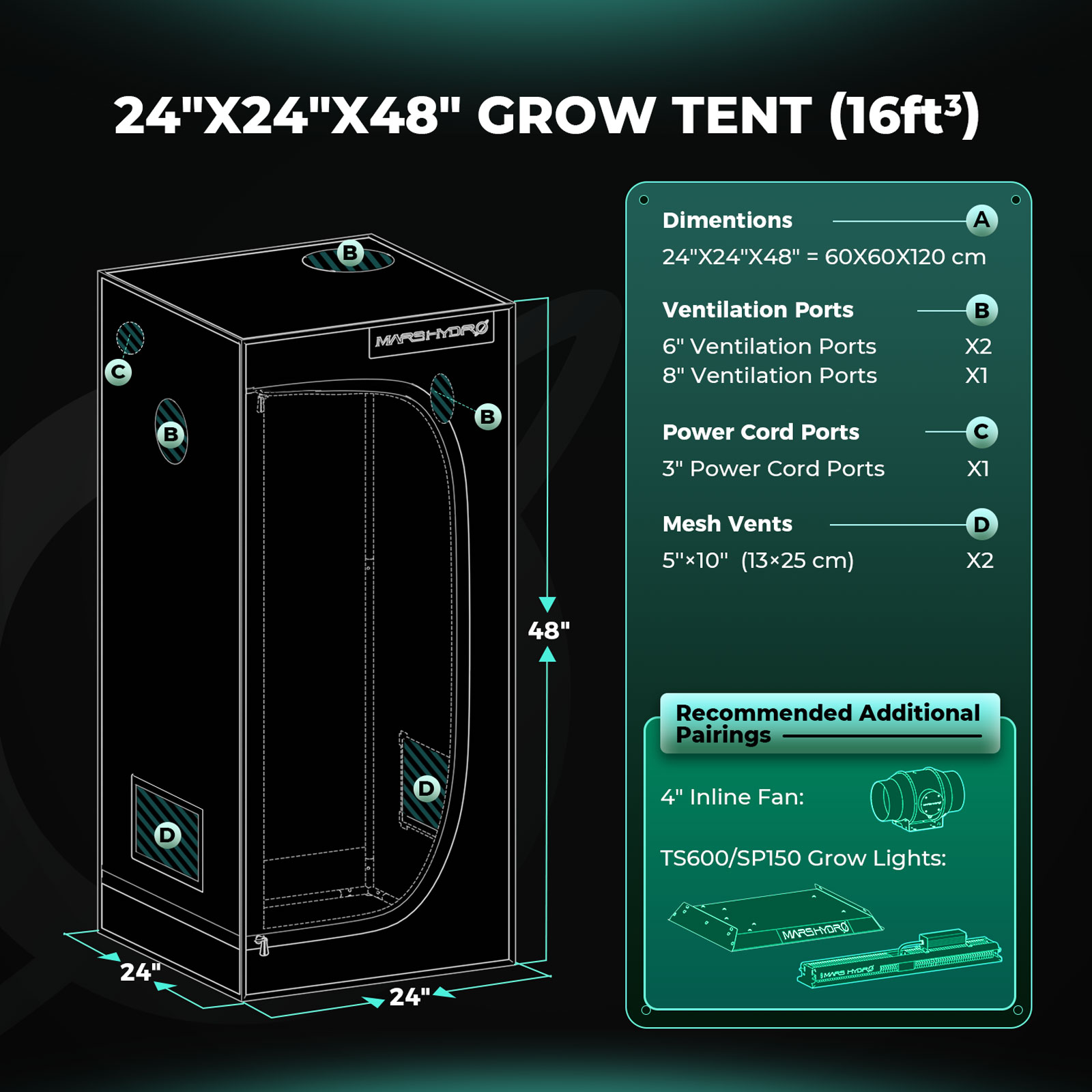 Mars Hydro 60x60x120cm sise-telk on loodud tagama optimaalsed tingimused taimede kasvatamiseks siseruumides. Telk on valmistatud vastupidavast 1680D Oxford kangast, mis on rebenemiskindel ja topeltõmmeldud, tagades pikaajalise kasutuse ja vastupidavuse. Telgi sisekülg on kaetud 95% valguspeegeldava ja rebenemiskindla mylar-kihiga, mis suurendab valgustugevust ja aitab hoida temperatuuri stabiilsena.