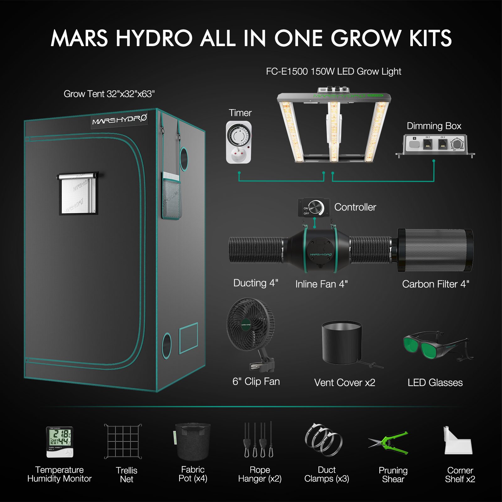 Mars Hydro FC-E1500 kasvutelkide komplekt on loodud tõhusaks ja mugavaks siseviljeluseks. Komplekt sisaldab kvaliteetset 150W LED Kasvulampi, mis on hämardatav ning tagab ühtlase valgusjaotuse kogu 80x80cm kasvualal. Sellel on hea soojuse hajutamise süsteem, mis aitab vältida taimede ülekuumenemist.