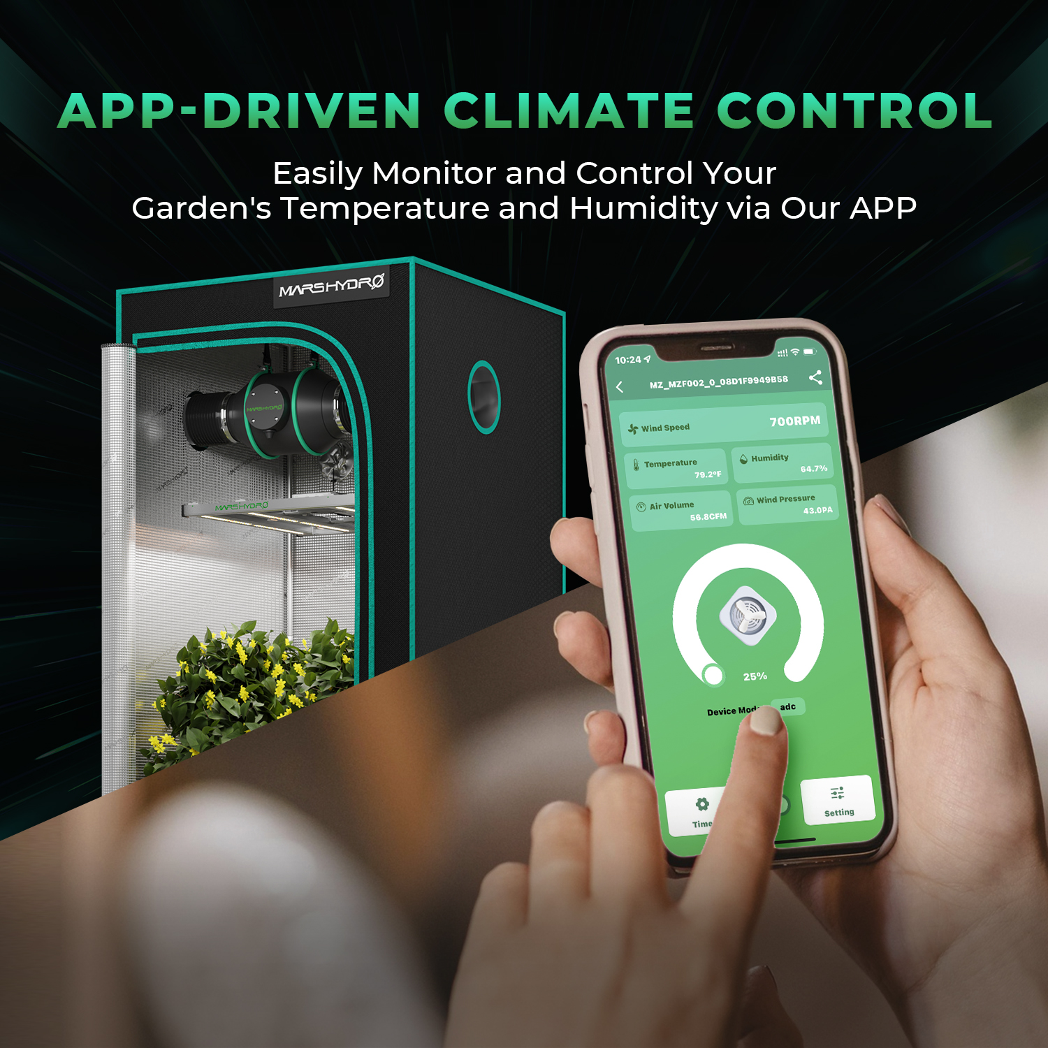 - Nutikas kiirusekontroll koos MarsHydro rakendusega võimaldab kaugjuhtimist ja täpset seadistust