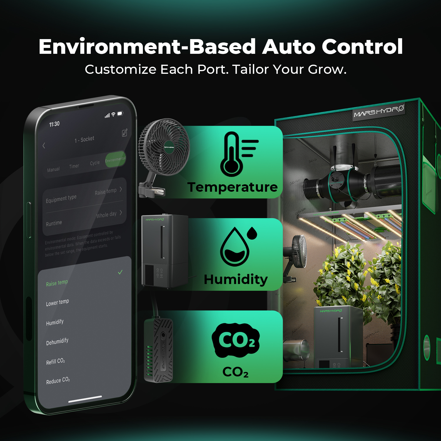 - Keskkonnarežiim kasutab reaalajas temperatuuri, niiskuse ja CO₂ andmeid automaatseks seadmete juhtimiseks, näiteks niisutid, kuivatid ja ventilaatorid.