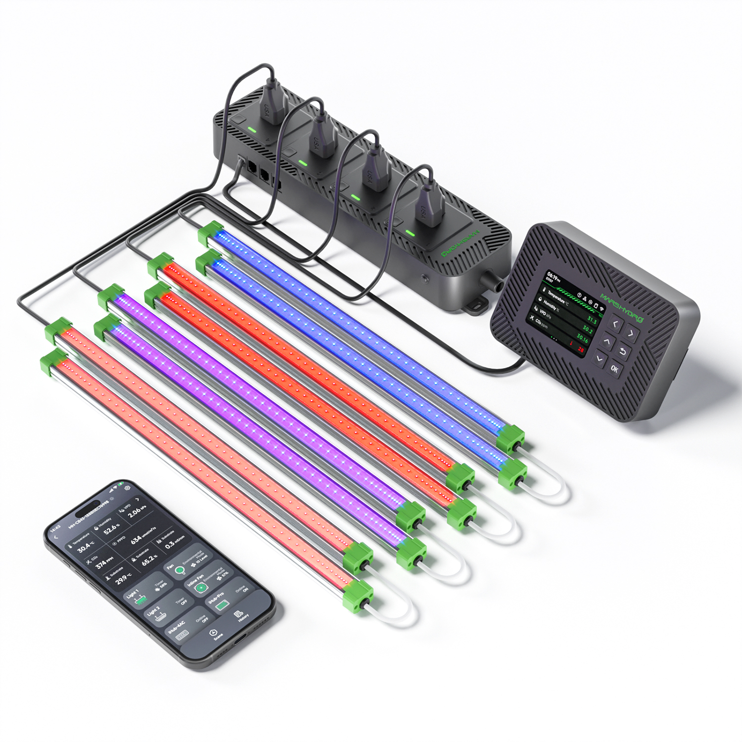 Mars Hydro Nutikas iControl + iHub-4AC + ADlite UV 30 + IR 15 + Red 30 + Blue 30 Täiendavate LED Kasvulampide Komplekt on loodud taimede kasvatamise täiustamiseks, pakkudes laia valikut valgusspektri ribasid koos nutika juhtimissüsteemiga. See komplekt võimaldab kasutajal täpselt reguleerida UV, IR, sügavpunase ja sinise valguse hulka vastavalt taimede kasvufaasidele, et toetada optimaalset arengut ja saagikust.