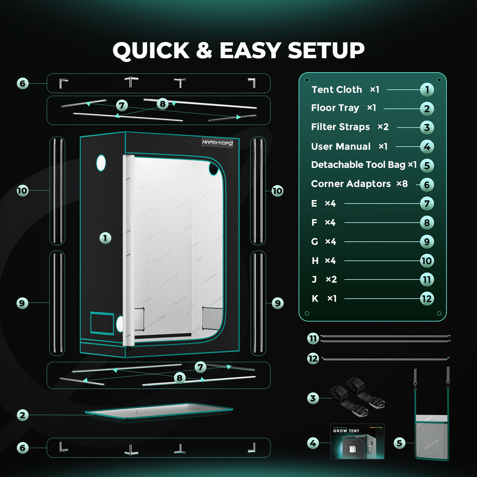 • Lisatarvikud: kasvuruumi prillid, trellvõrk, kasvukotid, oksakäärid, nurgariiulid, õhufiltri katteid, köie riputid