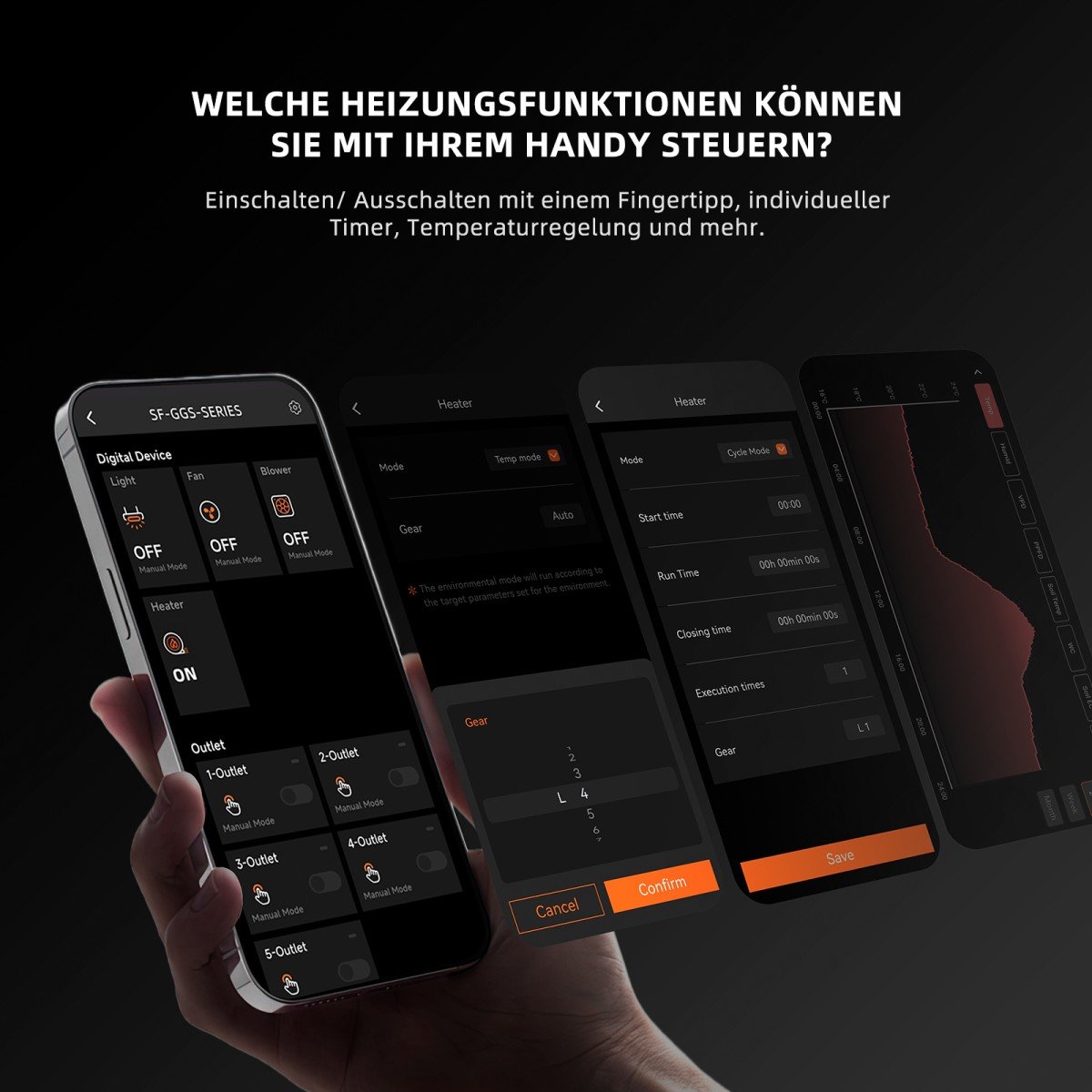 • Nutikas temperatuuri juhtimine: 10 reguleeritavat kütte- ja ventilaatoritaset, mis võimaldavad täpset temperatuuri reguleerimist. See funktsioon aitab hoida kasvutemperatuuri stabiilsena, mis on eriti oluline külmematel kuudel.