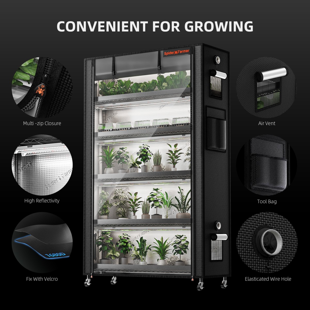 Spider Farmer 6-astmeline taimeriiul LED kasvulampidega 220W, 1680D telk ja 4 seemnekülvialust