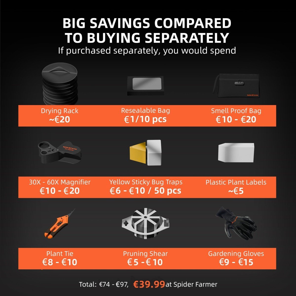 Spider Farmer 9-in-1 komplekt on ideaalne valik neile, kes otsivad tõhusat lahendust taimede hooldamiseks. Komplektiga säästate aega ja raha, kuna see pakub kõike vajalikku ühes komplektis. See on praktiline investeering igale aiandushuvilisele.