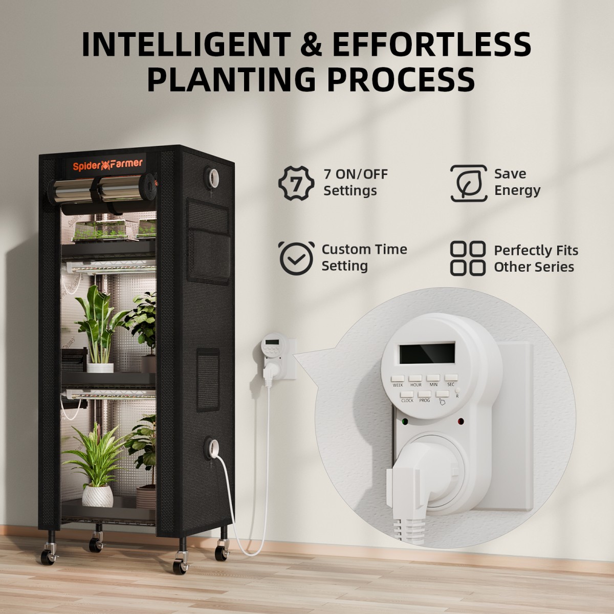 Spider Farmer digitaalne programmeeritav taimer on usaldusväärne lahendus elektriseadmete automaatseks juhtimiseks siseaianduses ja kodus. See taimer võimaldab kuni 20 erineva sisse- ja väljalülitustsükli seadistamist, pakkudes paindlikkust igapäevaste, üle päeva või iganädalaste tsüklite loomiseks. Tänu kiirele tsükli seadistusele saab nädalapäevad, tunnid ja minutid hõlpsasti määrata ning kohandada vastavalt vajadusele.