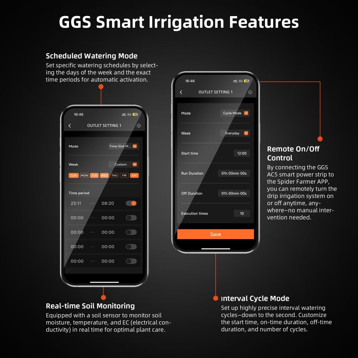 - Automaatne juhtimine: GGS AC5 toiteplokk võimaldab seadistada individuaalseid ajakavasid ja režiime, et tagada täpne kastmine vastavalt taimede vajadustele. See funktsioon muudab taimede hooldamise lihtsaks ja muretuks.