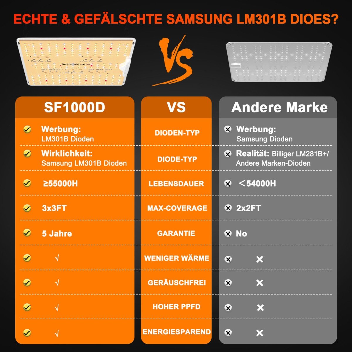 Spider Farmer SF1000D LED kasvulamp on loodud pakkuma täisspektrilist valgustust, mis sobib ideaalselt taimede kasvatamiseks alates seemnest kuni saagini. Kasutades Samsung LM301B dioode, tagab see lamp kõrge efektiivsuse ja energiasäästu. See on ideaalne valik nii algajatele kui ka kogenud kasvatajatele, kes soovivad oma siseruumides kasvatatavaid taimi toetada.