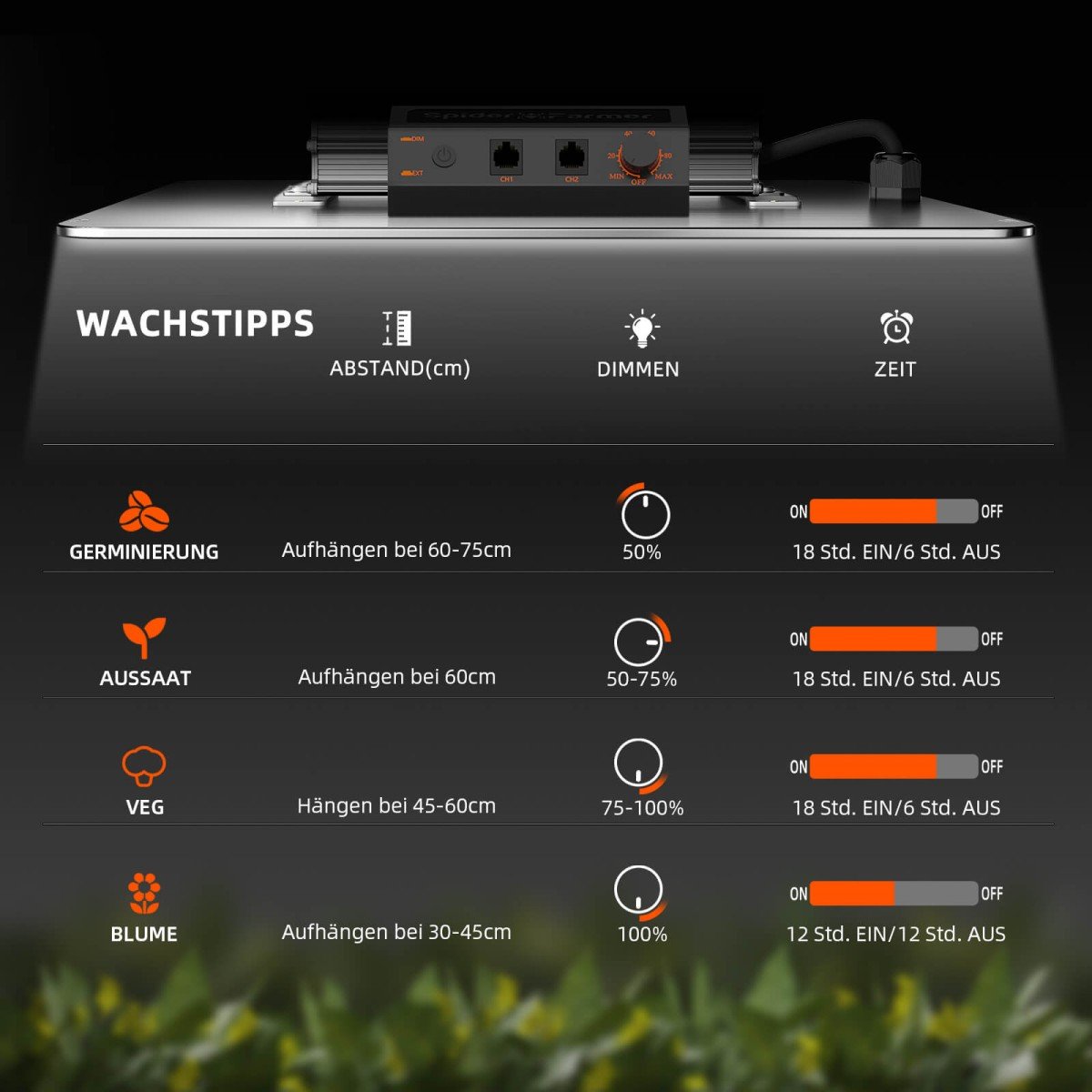 - Täisspekter: 3000K, 5000K, 660nm ja IR 760nm, mis kiirendavad õitsemist ja suurendavad saagikust, pakkudes taimedele vajalikku spektrit igas kasvufaasis.